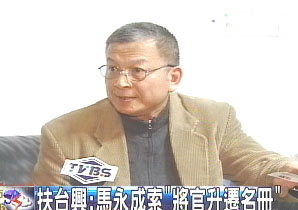 中國臺灣網4月20日消息 據臺灣TVBS電視臺報道,曾經指控前陳水扁辦公室副秘書長陳哲男涉嫌賣官的臺軍前少將扶臺興,昨天晚間再度驚爆,前陳水扁辦公室主任馬永成也曾出面要過臺軍“將官升遷呈報名冊”,扶臺興還強調,以馬永成的職位,根本不該來關心這件事;臺“立委”邱毅則是直接挑明,要名單當然就是為了買官和賣官。