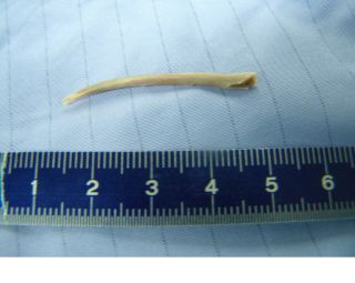孫賢斌表示,腹膜炎是危險(xiǎn)的疾病,必須緊急開刀治療,經(jīng)腹腔鏡手術(shù),赫然在患者胃部的下端發(fā)現(xiàn)一根已穿破胃壁的異物,一半穿出胃壁,一半留在胃內(nèi)壁,由于胃壁破洞,胃內(nèi)的液體和胃酸滲入腹腔內(nèi),造成腹腔蓄膿約300CC,導(dǎo)致腹膜發(fā)炎。經(jīng)手術(shù)取出異物,檢視后才知道是一根雞骨。