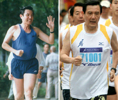 圖左,1998年5月31日,馬英九在30日宣布參選臺北市長,在住所附近興隆公園晨跑,10.5公里成績是47分55秒。圖右,2009年4月19日,馬英九在宜蘭蔣渭水高速公路參加馬拉松比賽,5公里耗時27分43秒。來源:臺灣《聯合報》