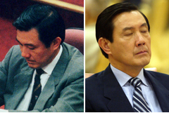 馬英九打瞌睡,圖左,1998年12月29日,馬英九剛當選臺北市長,圖右,2008年1月22日,馬英九代表國民黨參選臺灣當局領導人。來源:臺灣《聯合報》