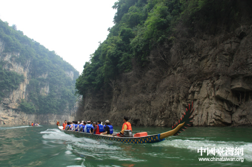 臺灣嘉賓乘龍舟游覽絕壁林立的九畹溪(中國臺灣網(wǎng) 焦瑩瑩 攝)
