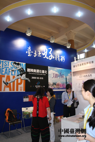2009北京國際旅游博覽會6月18日至20日在北京展覽館舉辦,“臺灣館”四度參展,并在5號館“安營扎寨”。強大的陣容、包館的形式堪稱歷屆之最:除了臺北縣、臺北市、苗栗縣、南投縣、高雄市等縣市觀光部門,臺灣各地旅游景區、合格接待社、高級渡假村及酒店、主題樂園、美食餐飲、觀光購物商店等在內的33家參展商匯聚于此,在大陸居民赴臺游開放即將一周年之際,為參觀者呈現了一套豐盛的臺灣旅游大餐。