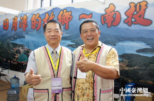 南投縣政府觀光處處長(zhǎng)洪文能(左)和南投金都餐廳總經(jīng)理王文正,向大陸同胞推介南投這個(gè)觀光旅游的好地方。(中國(guó)臺(tái)灣網(wǎng)記者 張弛 攝)