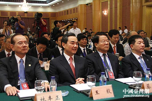 第五屆兩岸經貿文化論壇專題報告7月11日上午在長沙舉行,圖為中共中央臺辦主任王毅(前排左二)和中國國民黨副主席林豐正(前排左一)等出席。(中國臺灣網 鐘寶華 攝)