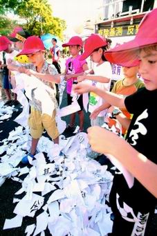 臺灣家長團體昨天在臺北市發起“我要免試的12年義務教育”大游行,許多小朋友跟著爸媽上街頭,一起撕“準考證”。(來源:臺灣《聯合報》)