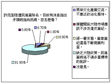 中國臺灣網(wǎng)7月29日消息 臺灣《中時電子報》最新在線民調(diào)“許、范登陸遭民進黨除名,目前有消息指出矛頭將指向民視,您怎么看?” 至29日上午8點為止,累計投票897票,超過八成參與投票的臺灣網(wǎng)友選擇“缺乏大陸政策,民進黨將逃不過多重標準的批評。”