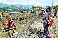 臺(tái)軍方挖掘行動(dòng)昨天截止,但母親遭埋的高雄縣六龜新開(kāi)居民卓靜鴻(右)不愿放棄,昨仍要求民間機(jī)具定點(diǎn)開(kāi)挖。來(lái)源:臺(tái)灣《蘋(píng)果日?qǐng)?bào)》