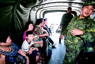 “芭瑪”臺風威脅下,高雄縣六龜鄉(xiāng)寶來村民昨天全部撤離,老老少少搭乘軍車下山。來源:臺灣《聯(lián)合報》