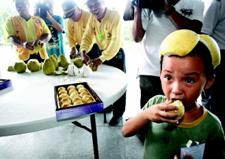 中秋節(jié)還是要過的,一貫道天臺山道場為撤離家園的民眾,準備了月餅跟柚子,小朋友戴起柚子帽。來源:臺灣《聯(lián)合報》