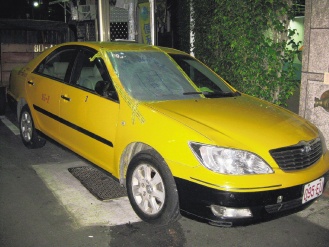 出租車司機林淵晟疑口角引殺機,昨天凌晨在臺北市八德路從后方撞死乘客杜贊修,報警后又逃逸無蹤。林的出租車在汐止新臺五路尋獲,前擋風玻璃右側撞出大洞。(圖片來源:臺灣《聯合報》)