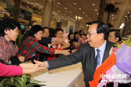 “中原文化寶島行”代表團抵達臺北桃園機場,島內民眾自發到機場迎接,圖為徐光春向前來歡迎的民眾揮手致意。圖片來源:河南省臺辦