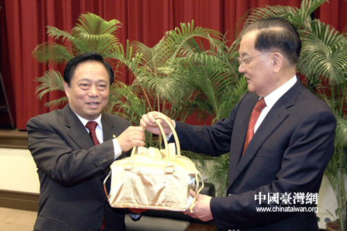 連戰(zhàn)向梁國揚贈送臺灣特產茶葉。(中國臺灣網 田云鵬 攝)