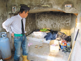 桃園縣黃姓男子窮困潦倒,春節期間住進觀音鄉第一公墓廢棄祖塔,平常穿軍服、戴軍帽打零工。圖片來源:臺灣《聯合報》