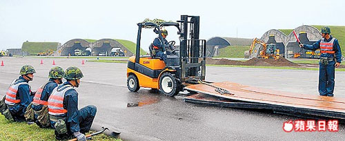 臺軍演練飛機跑道被毀時,以鋪設玻璃纖維板來搶救。來源:臺灣《蘋果日報》
