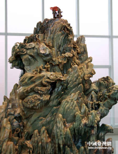 館內展出的一尊完成于上世紀60年代、重2.5噸的珍貴“玉山子”,內容為勇攀珠峰。(中國臺灣網 鐘寶華 攝)