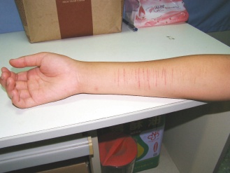學(xué)校輔導(dǎo)室老師昨天找小雅、小娟等人了解事件經(jīng)過,發(fā)現(xiàn)小雅右臂有密集刀痕,嚇了一跳。小雅一臉不在乎說:“割手腕又不會死人,兩年來我已經(jīng)割了200多刀!