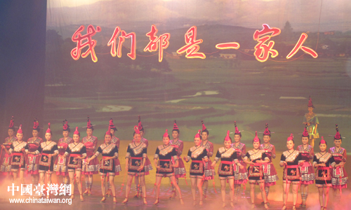 海峽兩岸少數(shù)民族聯(lián)誼交流會(huì)聯(lián)歡晚會(huì)以“我們都是一家人”為主題。圖為演員們?cè)谕頃?huì)上載歌載舞。(中國(guó)臺(tái)灣網(wǎng) 張碩 攝)