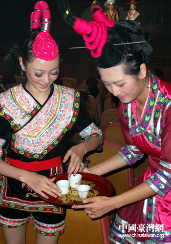 畬族姑娘為臺(tái)灣同胞斟酒,歡迎他們的到來(lái)。(中國(guó)臺(tái)灣網(wǎng) 張碩 攝)