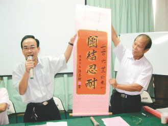 臺南市長許添財昨天未出席許添財之友會活動,但送來“團結忍耐”中堂,會場主戰氣氛濃厚。圖片來源:臺灣《聯合報》