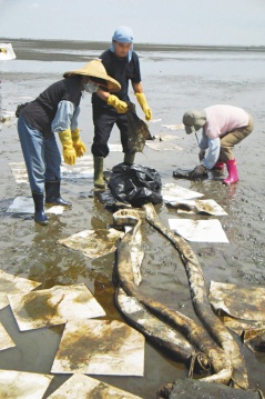 環保人員漏夜以攔油索、吸油棉清除油污,希望將生態危機降至最低。圖片來源:臺灣《聯合報》