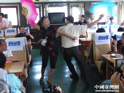 桂林市文化局在船上為臺(tái)灣嘉賓們準(zhǔn)備了具有地方特色的節(jié)目,而臺(tái)灣嘉賓也不甘示弱,與桂林的藝術(shù)家輪流上場(chǎng),于是在漓江上演了一場(chǎng)兩岸文化界人士的聯(lián)歡。