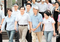 馬英九(前排左二)25日在黃昭順(前排左一)、高雄市長陳菊(后排右一)等人陪同下,前往高雄文藻外語學院了解“凡亞比”臺風重創后的復原狀況,不過陳菊陪同時總是和馬英九保持距離。