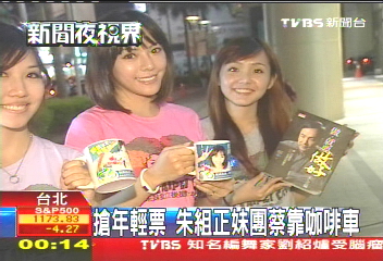 據報道,朱立倫于昨日晚間成立了“正妹助選團”,共5名美女成員,其中有一位還曾與鐘漢良拍過戲。5名美女身穿印有朱立倫頭像的T恤,忙碌地派發文宣,推銷商品,幫忙募款,還要與前來合影的臺灣年輕民眾合影,“正妹團”的一名成員“米果”表示實在是太過忙碌,不過感覺“很值得”,算是經驗和學習。