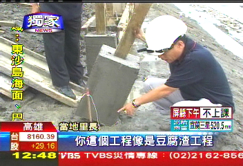 據畫面顯示,前來調查的一名高雄市議員可以不費力的用2根手指把水泥臺座推倒,工程的“豆腐渣”程度還真讓人不可思議。高雄市楠梓地區里長怕水災噩夢重演,要求承包商立即停工調查。承包商表示,這是圖紙公司設計問題,我們只是按照圖施工。