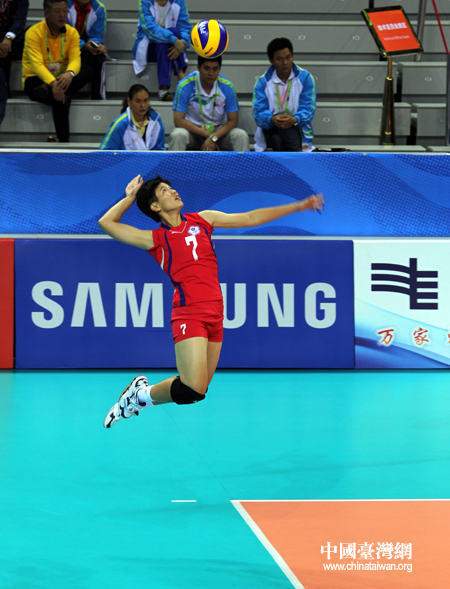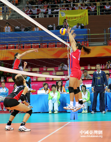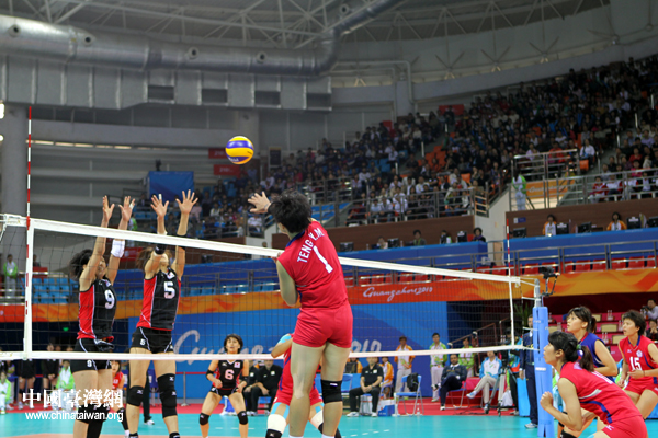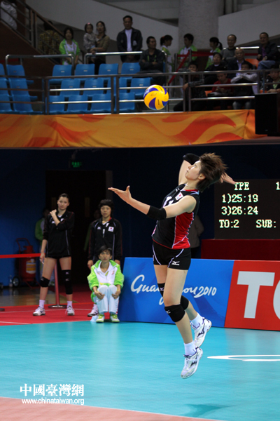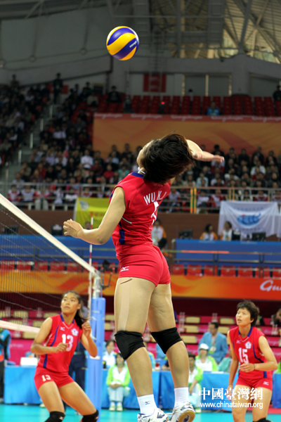 18日下午,廣州亞運會女排預賽開打,中華臺北隊2:3惜敗日本隊。圖為中華臺北隊奮力扣殺。(中國臺灣網 鐘寶華 攝)