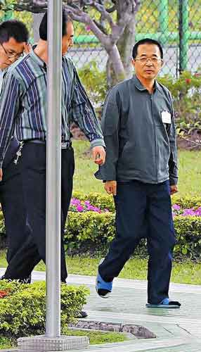 陳水扁昨天從舍房前往特別接見室時,由臺北監獄秘書(左)及3名管理員陪同戒護,秘書一直跟在陳水扁身邊。圖片來自網絡