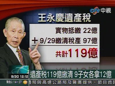 王永慶2008年10月突然過世,據(jù)指出,王永慶在島內(nèi)共留下595億元的遺產(chǎn),共需繳交119億元的遺產(chǎn)稅,其中,在去年9月有113億元入帳,使得9月份的遺產(chǎn)稅實征凈額達133億元,創(chuàng)下的史上單月新高紀錄。另外6億元的實物抵繳部分,也在11月由臺當局“財政部國有財產(chǎn)局”完成土地變更為公有。119億元的遺產(chǎn)稅悉數(shù)上繳,如果再加上28億元的贈與稅,合計王家去年共繳交了147億元的遺贈稅。(中國臺灣網(wǎng) 馮江)