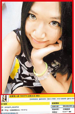 賬號“水瓶座企鵝”的網(wǎng)友在拍賣網(wǎng)站上張貼了一張大眼美女照,拍賣“出租女友”,最后以近10億元天價結(jié)標(藍框處)。 來源:臺灣媒體
