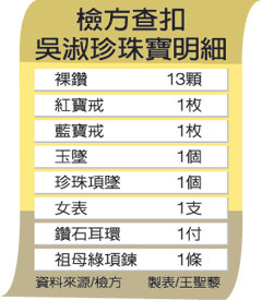 報道稱,臺特偵組于偵查中2度搜索扁家,將吳淑珍珍藏的大量珠寶扣案。這些珠寶琳瑯滿目,包括從扁家友人黃芳彥西裝口袋找到的裸鉆一共13顆、紅寶戒1只、藍寶鉆戒1只、玉墜1顆、珍珠項墜1條、女表1支、鉆石耳環(huán)1付、祖母綠項鏈1條,價格不詳。
