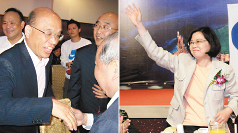 呂秀蓮宣布參選2012后,蘇貞昌(左)昨日主動出招,邀請民進黨主席蔡英文(右)辟室密談。會后雙方強調,蘇蔡2人都感受到支持者的焦慮。資料圖片來源:臺灣《聯合報》