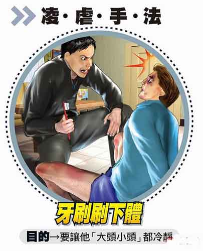報道稱,楊為“回應”好友讓他戴綠帽,囚禁期間,以牙刷沾牙膏刷洪男下體,要他“大頭小頭都冷靜”;并用酒瓶套在洪男手指上硬折,以熱溶膠燙手臂等方式,要讓洪男“記憶深刻”;并連續3天播放佛經要洪“自省改過”。