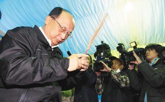 臺中市長胡志強昨天到殯儀館向臺中夜店大火中不幸罹難者上香,他沉重地說“大悲無言”,會全力照顧家屬。圖片來源:臺灣《聯合報》