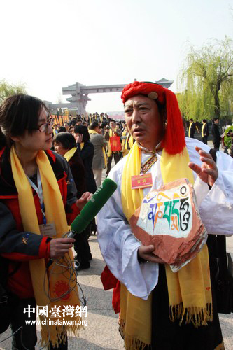 一位少數(shù)民族參會(huì)者在展示他帶來的祈福藝術(shù)品。(中國(guó)臺(tái)灣網(wǎng) 馬迪 攝)