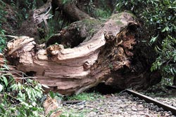 砸中列車、倒伏在鐵軌旁的森氏櫟支干,下半部木質顏色正常、上半部卻可見黑壓壓一片的腐朽痕跡。片來源:臺灣《中國時報》