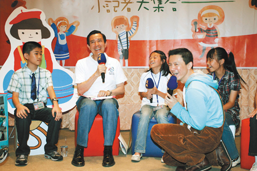 據報道,馬英九辦公室15日來了一群小嬌客,他們是由臺北、臺中、臺南11間小學共12名小學生組成的“小記者團”,到馬英九辦公室“拷問”馬英九。末日、選舉、馬小九、馬英九的零用錢,小記者團的問題包羅萬象。