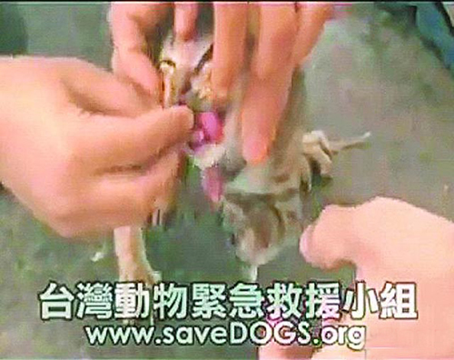 硬塞,小孩最后掰開小貓的嘴,試圖塞入幼鼠。圖片來源:臺灣媒體