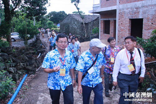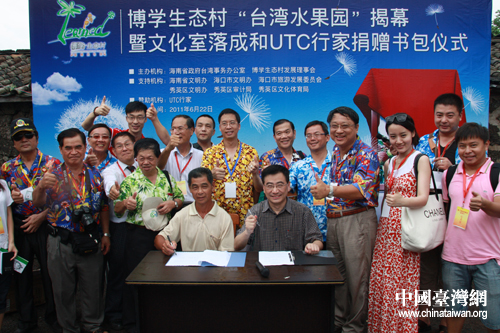 上午,記者們來到海口市秀英區永興鎮博學生態文明村參觀。據村長介紹,2009年11月,博學村在村里第一個大學生陳統奎的組織帶領下,確定了將博學村從一個傳統農村轉型為一個結合有機農業、生態保育和休閑體驗為一體的教育基地的發展愿景。2010年6月2日,博學村與臺灣桃米村簽署姐妹村協議,成為兩岸第一例姐妹村,堪稱瓊臺基層交流的典范。同天,由海南省臺辦牽頭資助的臺灣水果園也正式啟動建設。