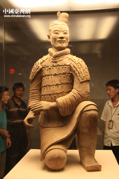 跪射俑——身穿戰(zhàn)袍,外披鎧甲,頭頂左側(cè)挽一發(fā)髻,腳登方口齊頭翹尖履,左腿蹲曲,右膝著地,上體微向左側(cè)轉(zhuǎn),雙手在身體右側(cè)一上一下作握弓狀,表現(xiàn)出一個持弓的單兵操練動作。(中國臺灣網(wǎng) 楊永青 攝)