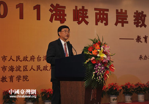 2011年海峽兩岸教育論壇在北京開幕,前花蓮市長、臺灣東華大學教授葉耀輝代表來自臺灣的100多位校長和教育界人士致辭(北京市臺辦 王松 攝)