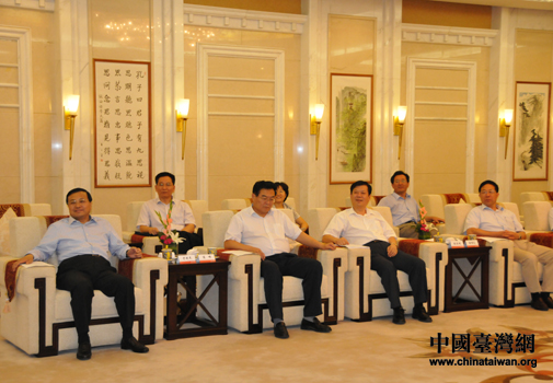 山東省副省長才利民,省政府副秘書長蒿峰、張明忠,山東省臺辦主任倪明遠、副巡視員曹曉武等參加會見(圖片來源:山東省臺辦)