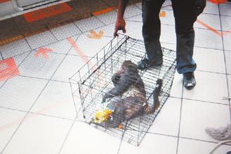 高雄市消防局表示,昨天上午九時九分,左營站員工發現第三站臺內側梁柱上有只獼猴亂竄,立即出動多人,攜帶捕獸夾、捕獸網及鐵籠趕往。獼猴非常機警,見一群人“來意非善”,在站臺梁柱間跳來蕩去,再由站臺外側往大廳梁柱移動,把后面“始終慢一步”的圍捕人員急得團團轉。 圍捕人員力斗不過想智取,拿出香蕉誘捕,獼猴跳下來撿起香蕉大口吃,但圍捕人員靠近,獼猴立即跳上梁柱,亂得他們只好干瞪眼。