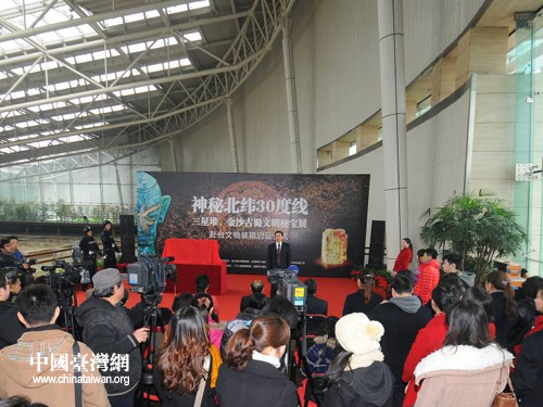 “神秘北緯30°線——三星堆、金沙古蜀文明秘寶展”赴臺文物裝箱起運儀式在成都市金沙遺址博物館舉行。(圖片來源:四川省臺辦)