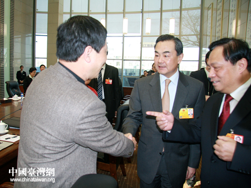中共中央臺辦、國務院臺辦主任王毅出席十一屆全國人大五次會議臺灣代表團全體會議。圖為王毅同臺籍人大代表親切握手。(中國臺灣網 王偉 攝)