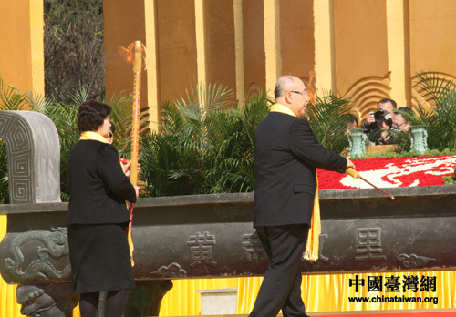 中國國民黨榮譽(yù)主席吳伯雄偕其夫人戴美玉出席壬辰年黃帝故里拜祖大典并向軒轅黃帝敬獻(xiàn)頭香。