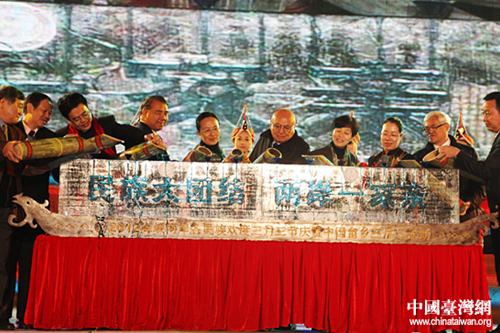 兩岸少數民族代表共同將“團結之水”注入容器。(中國臺灣網 劉承思 攝)