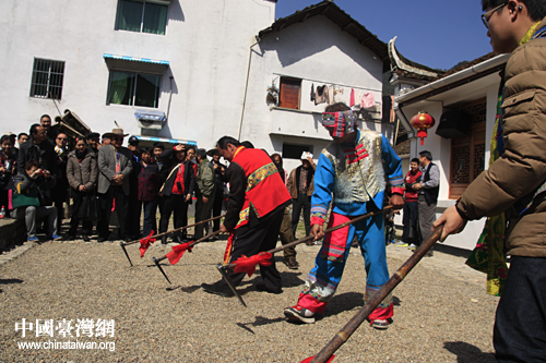 “新郎”、“赤郎”跟隨畬民表演耕種。(中國臺灣網 劉承思 攝)